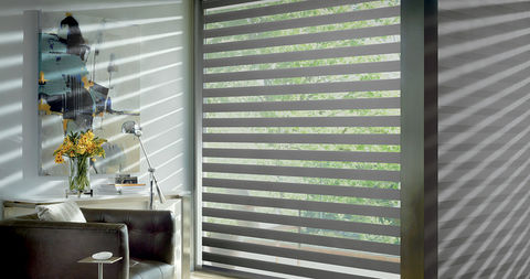 Zebra shades are anything but. Also known as layered or banded shades, these unique window treatments are a spin on a standard roller shade. They combine alternating sheer and solid fabric bands on a single shade, for a solution that gives you two options for light.